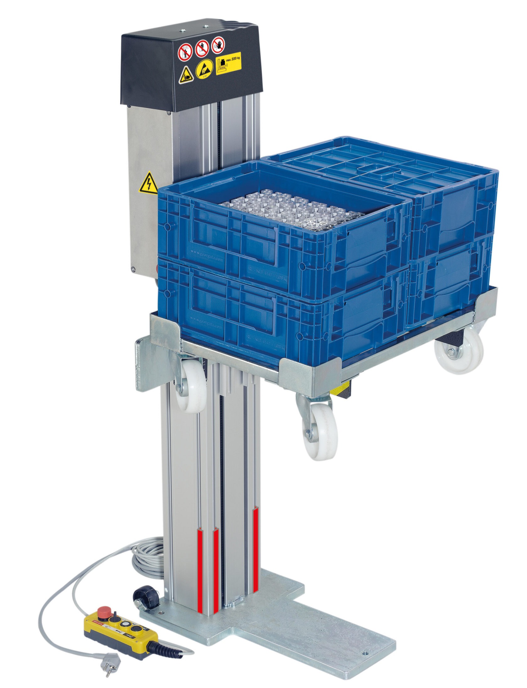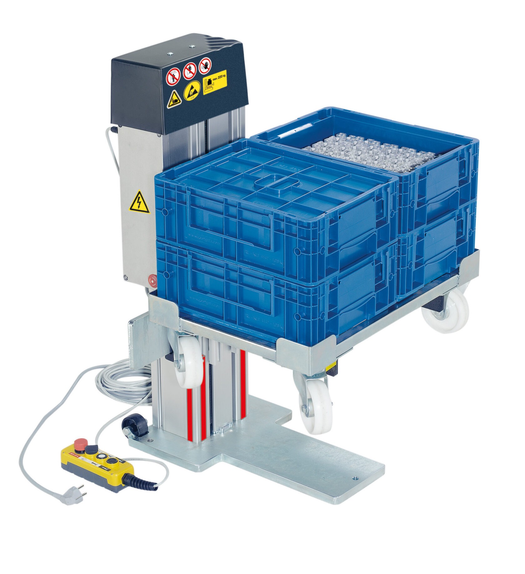 Les élévateurs de caisses facilitent l’alimentation ergonomique des postes de travail en relevant et abaissant automatiquement des bacs, limitant les efforts physiques et les postures inconfortables.